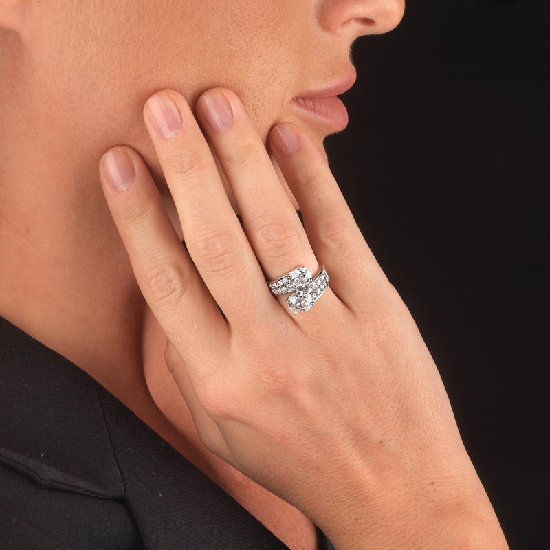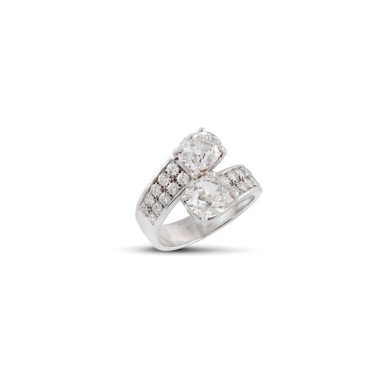 in oro bianco 18kt, impreziosito agli apici da due diamanti taglio antico per ct 2.50 circa, affiancati da diamanti taglio brillante per ct 0.60 circa, punzone 750, mis. 53, gr. 7
