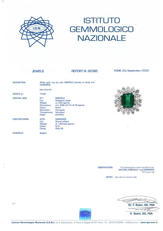 ANELLO FLOREALE CON SMERALDO ZAMBIA E DIAMANTI in oro bianco 18kt, con al centro uno smeraldo zambia taglio ottagonale di ct 3.25 circa, circondato da diamanti taglio brillante per ct 1.60 circa, colore G/H, purezza Vvs/Vs, mis. 51, gr. 10. Corredato di certificato IGN del 20/09/2022 attestante le caratteristiche e l'orgine della pietra.