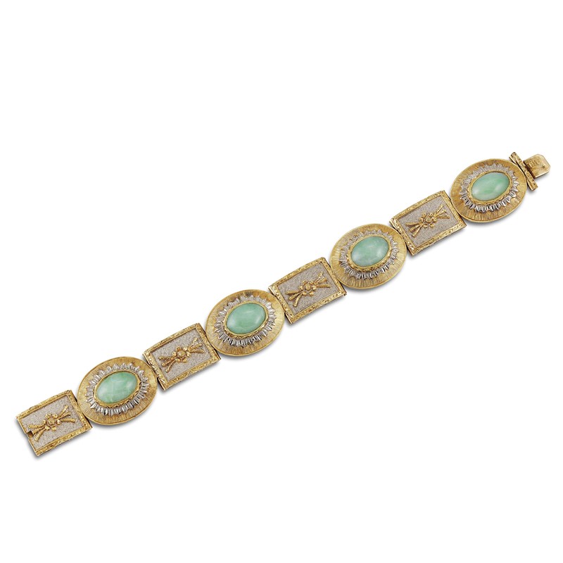 in oro giallo e bianco 18kt, satinato e microgranulato, composto da una serie di maglie rettangolari alternate ad elementi ovali impreziositi da giada taglio cabochon, lungh. cm 19, gr. 56