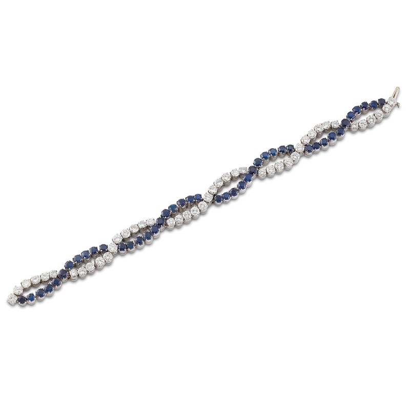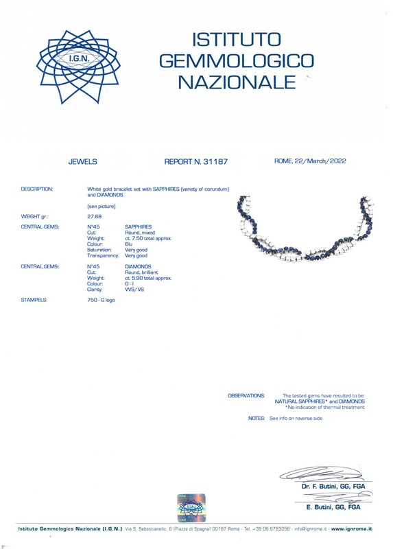 BRACCIALE CON ZAFFIRI E DIAMANTI in oro bianco 18kt, realizzato seguendo un motivo a intreccio, impreziosito da una serie di zaffiri taglio rotondo per ct 7.50 circa, alternati ad una fila di diamanti taglio brillante per ct 5.90 circa, colore G-I, purezza VVs/Vs, punzoni 750 e del fabbricante, lungh. cm 17, gr. 27. Corredato di certificato IGN del 22/03/2022 attestante le caratteristeche e l'assenza di trattamenti termici.