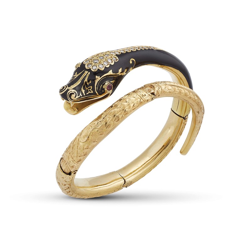 SNAKE-SHAPED RUBY AND DIAMOND BANGLE IN 18KT YELLOW GOLD AND ENAMELS