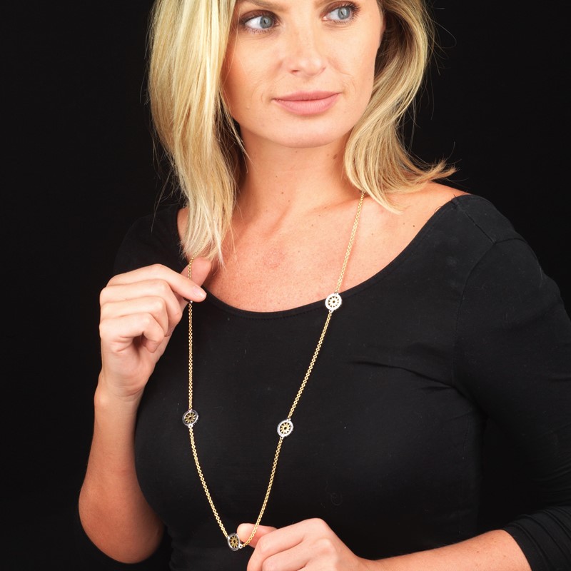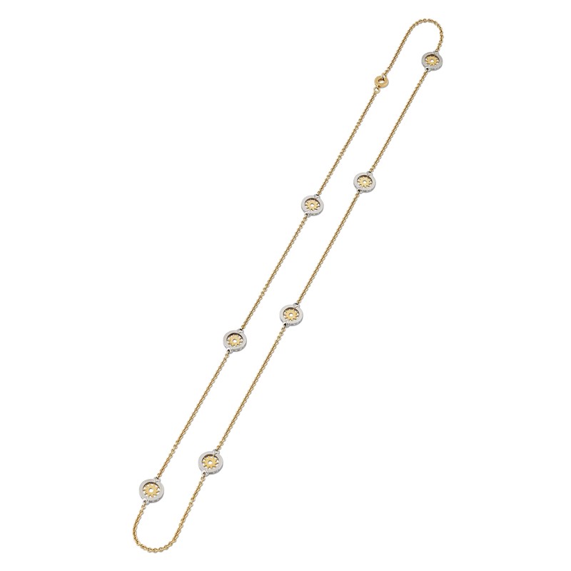 in oro giallo e bianco 18kt, composta da maglia a catena ed elementi circolari recanti al centro un motivo solare, firmata "Bulgari Bulgari", lungh. cm 92, gr. 36