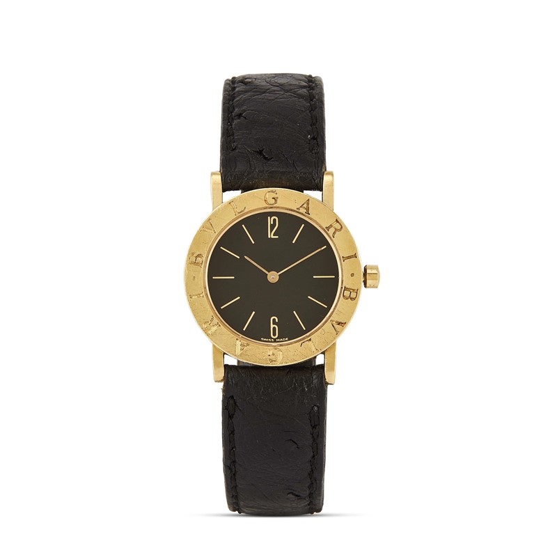 cassa in oro giallo 18kt, fondello a pressione, lunetta liscia in oro giallo firmata Bulgari, quadrante nero, indici e numeri arabi di colore oro, movimento al quarzo, cinturino in pelle nera firmato Jaeger LeCoultre, fibbia in acciaio, vetro minerale, gr. 41. Diam. mm 30. Corredato di scatola.