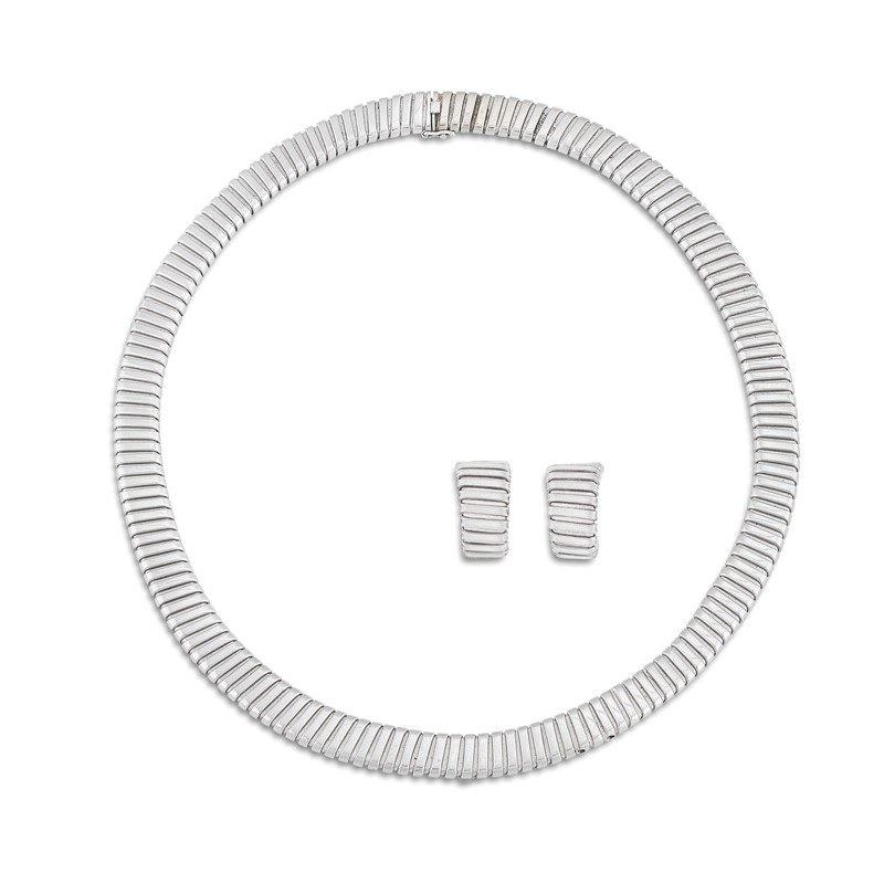in oro bianco 18kt, composta da collana e paio di orecchini tubogas di dim. cm 1x2 circa accompagnati da secondo paio di orecchini di dim. cm 2x3 circa e spilla a forma di tralci indossabile anche come pendente sulla collana, impreziositi da rubini taglio fantasia (uno mancante) per ct 10 circa e diamanti taglio navette, brillante e baguette per ct 11 circa, firmati "Bulgari", punzone 750, lungh. collana cm 42, dim. spilla/pendente cm 2,5x3 circa, chiusura orecchini a clip, gr. 106 complessivi