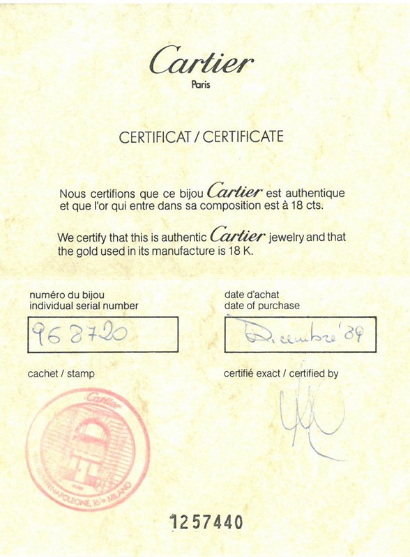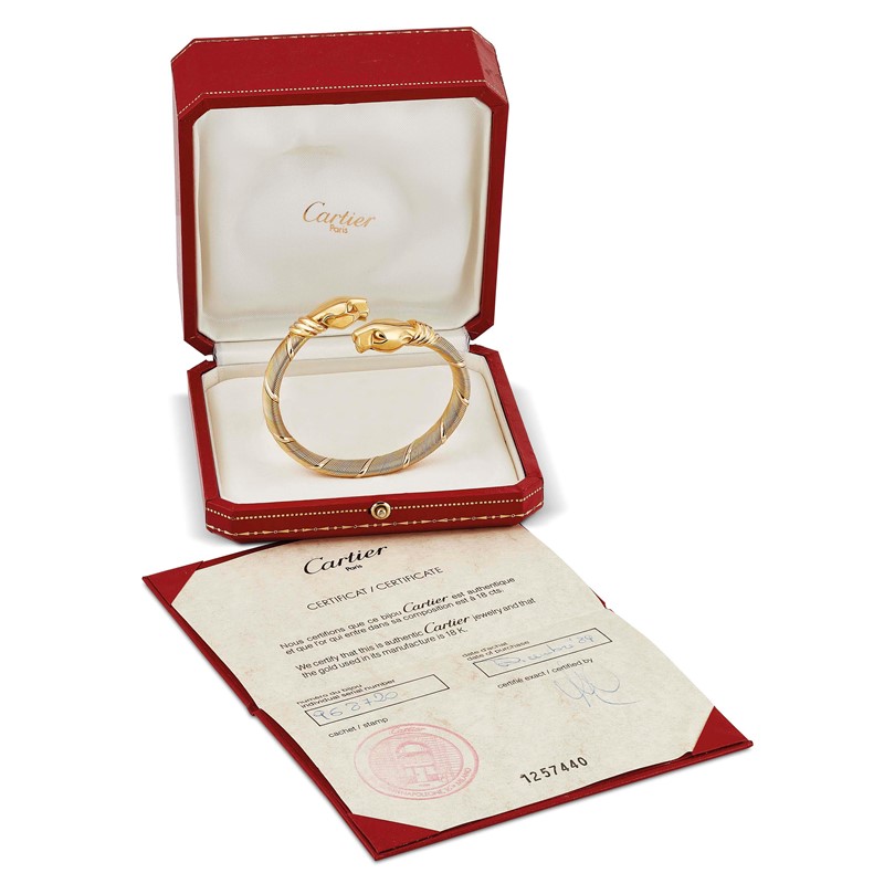 in oro giallo e bianco 18kt, firmato "Cartier", punzoni 750 e del fabbricante, dim. cm 6,5x6, diam. interno cm 6, gr. 49. Corredato di scatola e garanzia.