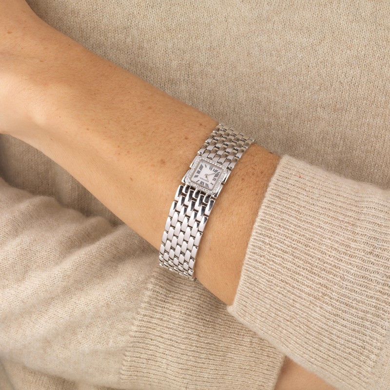 cassa di forma quadrata in oro bianco 18kt, fondello serrato con viti, lunetta in oro bianco 18kt impreziosita da una fila di diamanti, quadrante madreperla firmato Cartier, numeri romani, movimento al quarzo, bracciale a maglie in oro bianco 18kt, lungh. interna cm 19, chiusura doppia doployant a scomparsa in oro bianco 18kt, vetro minerale, gr. 98. Dim. mm 14x14. Corredato di chiave per la rimessa dell'ora.