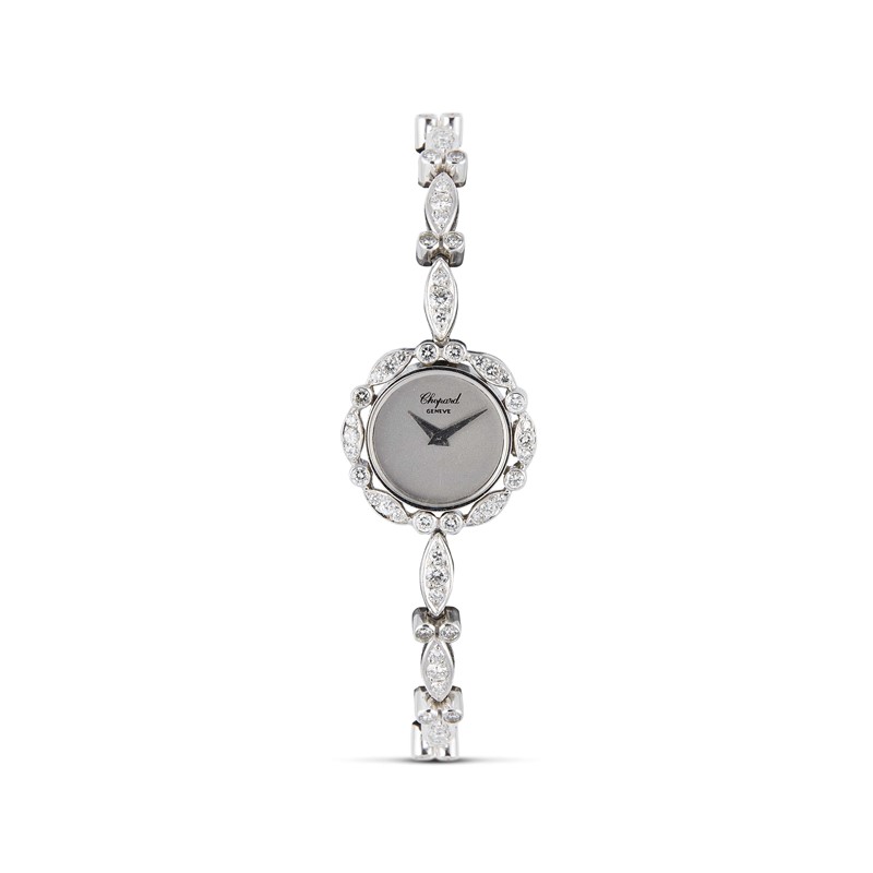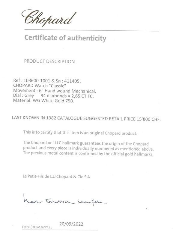 CHOPARD "CLASSIC" OROLOGIO DA DONNA cassa in oro bianco 18kt, quadrante grigio firmato "Chopard", ghiera e bracciale in oro bianco 18kt impreziositi da diamanti per ct 2.65, movimento a carica manuale, punzoni 750 e del fabbricante, lungh. cm 16,5, gr. 26. Corredato di custodia e garanzia. Diam. mm 20