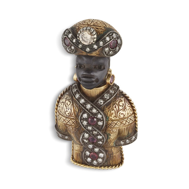 in oro, argento ed ebano, raffigurante un busto di moretto con turbante impreziosito da diamanti taglio brillante per ct 2 circa e rubini taglio rotondo per ct 0.50 circa, firmato "A.Codognato", dim. cm 3x5, gr. 35