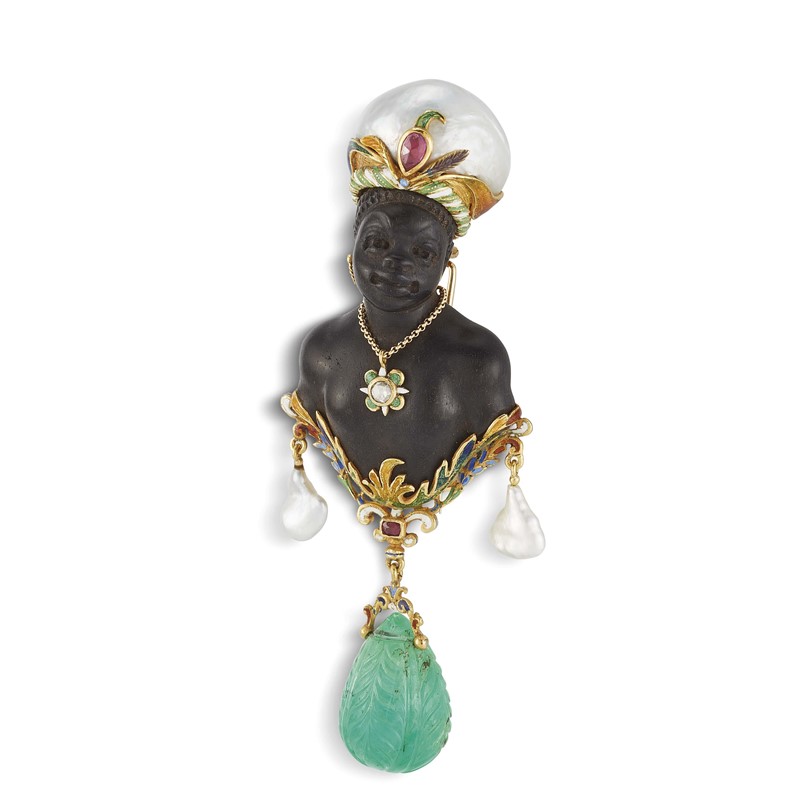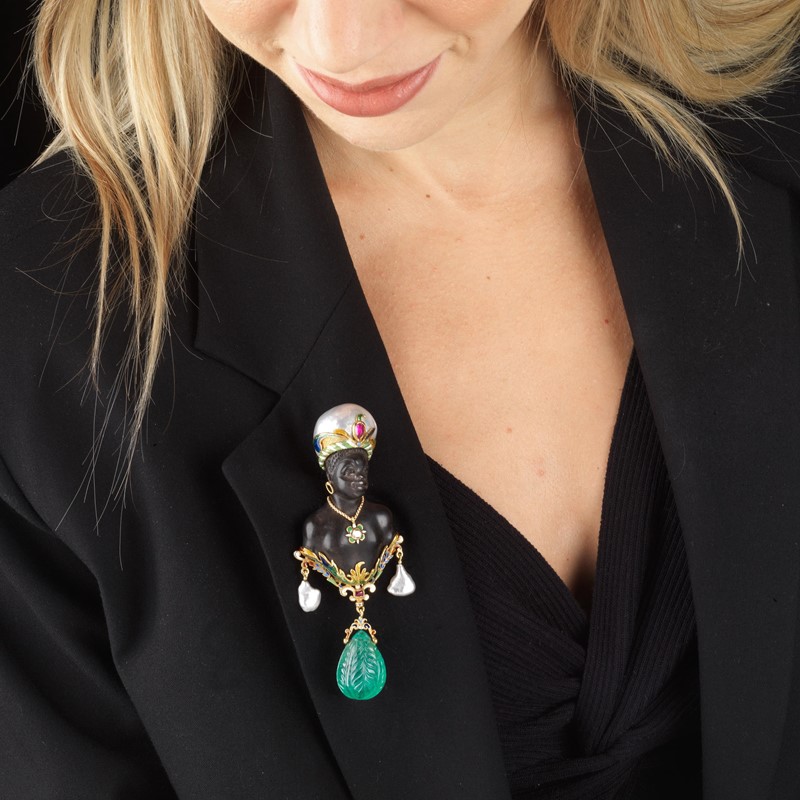 CODOGNATO SPILLA "MORETTO" CON SMERALDO PENDENTE in ebano e oro giallo 18kt, decorato in smalti policromi, impreziosito al centro da un diamante taglio a rosa e copricapo realizzato con una grande perla mabé e un rubino sfaccettato sul fronte, da cui pende una grande goccia di smeraldo con tralci incisi di mm 23x16 circa, firmata "A.Codognato", dim. cm 3,5x9,5, gr. 49. Corredata di scatola.