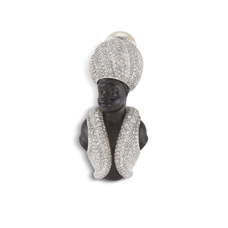CODOGNATO SPILLA MORETTO CON DIAMANTI in ebano e oro bianco 18kt, con abito e copricapo impreziosito da pavé di diamanti taglio brillante per ct 7 circa, copricapo sormontato da una perla mabé, firmata "Codognato", dim. cm 3,5x7, gr. 63. Corredata di scatola.