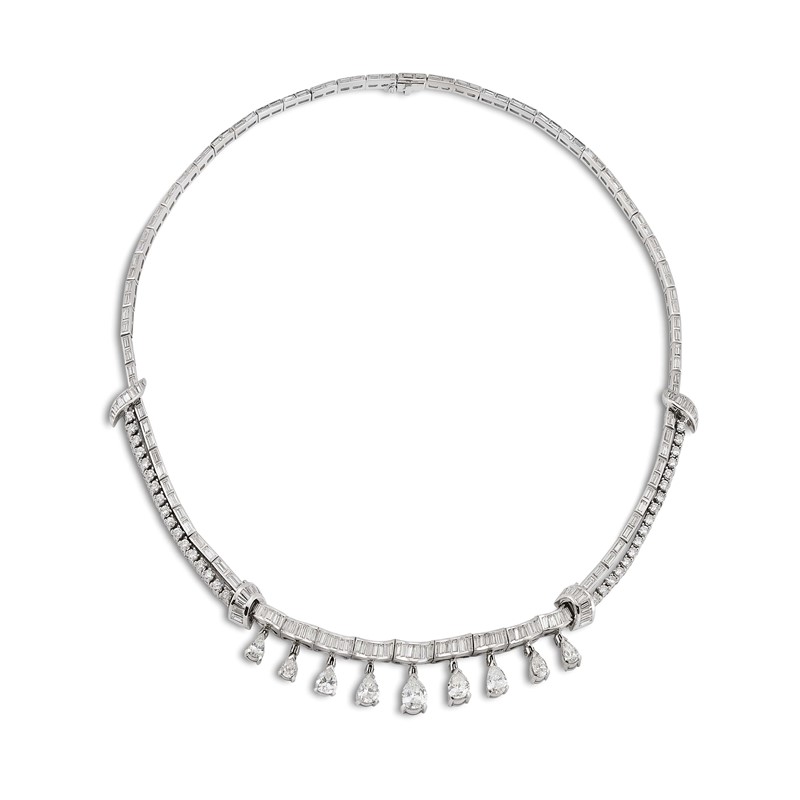 in oro bianco 18kt, composta da una fila di diamanti taglio baguette e brillante per ct 12 circa e una parte centrale dall'andamento ondulato da cui pendono nove diamanti taglio a goccia per ct 4.50 circa, lungh. cm 44, gr. 56