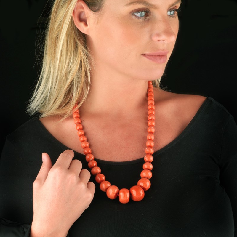 fermatura in oro giallo 18kt, composta da un filo di barilotti sfaccettati in corallo digradanti da mm 24x20 circa a mm 10x7 circa, lungh. cm 65, gr. 174