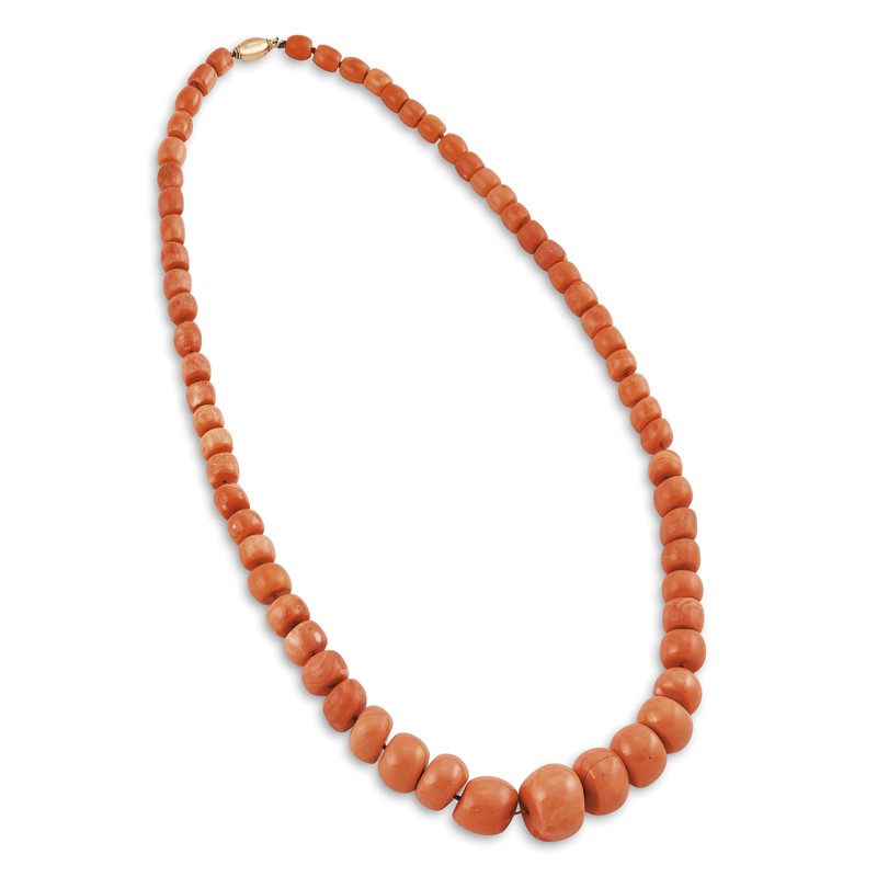 composta da una filo di barilotti in corallo digradanti da mm 21x17 circa a mm 7x8 circa, fermatura in oro giallo e bianco 18kt, lungh. cm 66, gr. 155