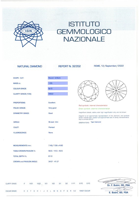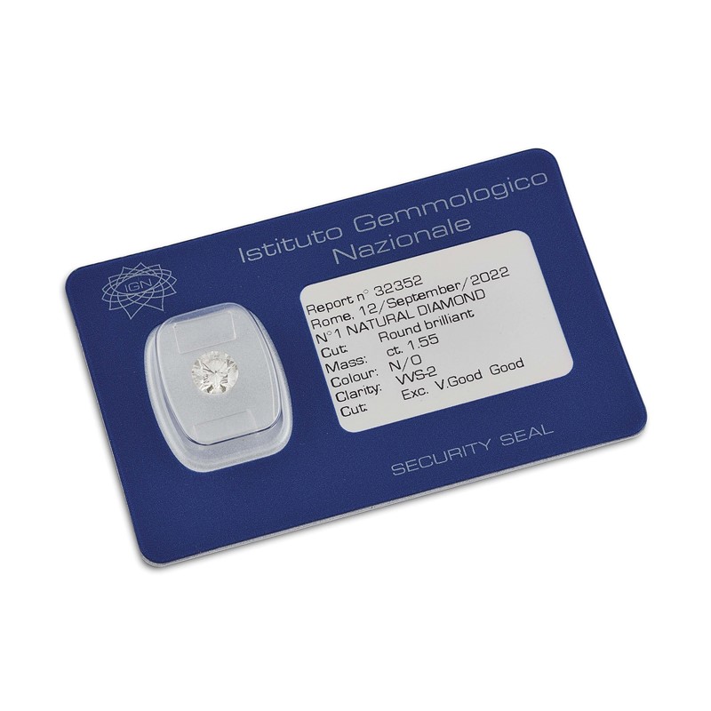 taglio brillante, di ct 1.55, colore N/O, purezza Vvs2. Corredato di certificato IGN del 12/09/2022 attestante le caratteristiche.