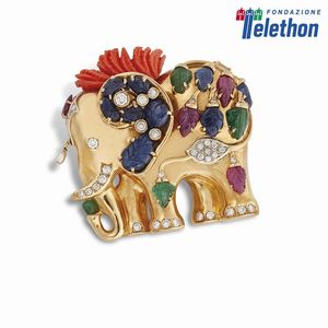 MORONI SPILLA A FORMA DI ELEFANTE in oro giallo 18kt, impreziosita da diamanti taglio brillante per ct 1.50 circa, [..]