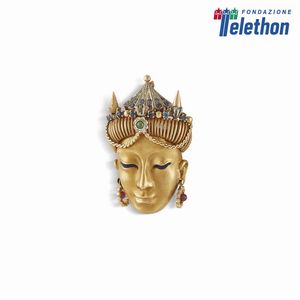 SPILLA FIGURATA CON ZAFFIRI in oro giallo e bianco 18kt, raffigurante il volto di una divinità indiana, [..]