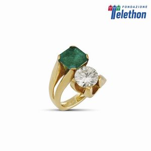 ANELLO CONTRARIE CON SMERALDO E DIAMANTE in oro giallo 18kt, impreziosito agli apici da uno smeraldo taglio ottagonale [..]
