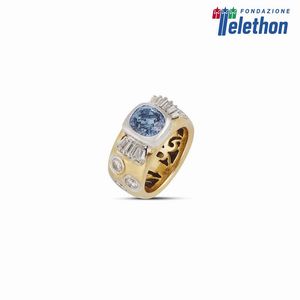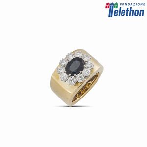GRANDE ANELLO A FASCIA CON ZAFFIRO E DIAMANTI in oro giallo e bianco 18kt, decorato sulla sommità da un [..]