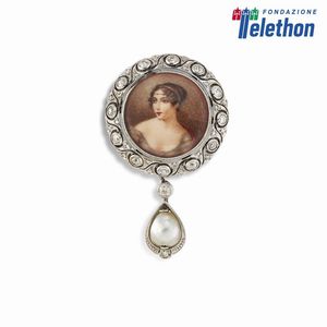 SPILLA CON MINIATURA in oro bianco 18kt e argento, di forma circolare, con al centro una miniatura in smalto [..]