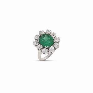 ANELLO A MARGHERITA CON SMERALDO E DIAMANTI in oro bianco 18kt, con al centro uno smeraldo taglio ottagonale di [..]