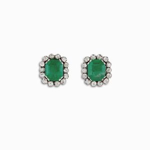 PAIO DI ORECCHINI A MARGHERITA CON SMERALDI E DIAMANTI in oro bianco 18kt, con al centro due smeraldi taglio ottagonale [..]