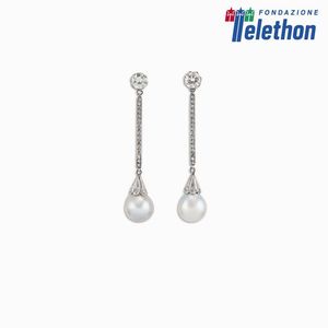 PAIO DI ORECCHINI PENDENTI CON PERLE E DIAMANTI in oro bianco 18kt, da cui pendono perle di mm 9 circa, impreziositi [..]