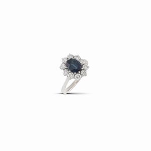 ANELLO A MARGHERITA CON ZAFFIRO E DIAMANTI in oro bianco 18kt, al centro uno zaffiro taglio ovale di ct 2 circa, [..]