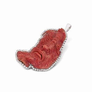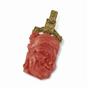 GRANDE PENDENTE IN CORALLO montatura e passante in oro giallo 18kt lavorati a sbalzo, con grande volto inciso [..]