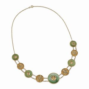 COLLANA CON DISCHI IN GIADA in oro giallo 18kt, catena a doppio filo con elementi circolari pendenti raffiguranti [..]