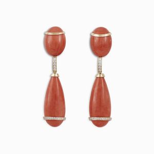PAIO DI GRANDI ORECCHINI PENDENTI IN CORALLO CON DIAMANTI in oro giallo 18kt, composti da coralli taglio cabochon [..]