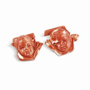 PAIO DI GEMELLI IN CORALLO montatura in oro giallo 18kt, raffiguranti dei grandi volti di bambino incisi su corallo, [..]