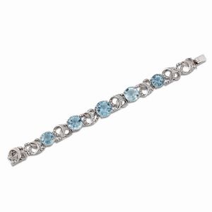 BRACCIALE CON ACQUAMARINE E DIAMANTI in platino, composto da una serie di maglie con volute impreziosite da diamanti [..]