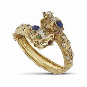 BRACCIALE ANIMALIER CON PIETRE DI COLORE E DIAMANTI in oro giallo e bianco 14kt, realizzato a contrarié, [..]
