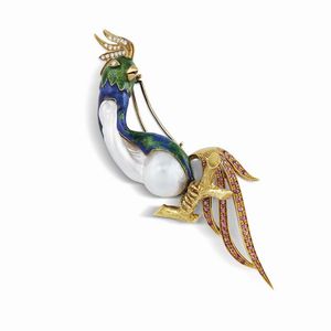 SPILLA UCCELLO DEL PARADISO in oro giallo e bianco 18kt, decorata in smalti policromi e impreziosita da una grande [..]
