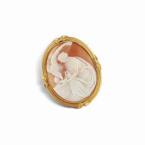 SPILLA CON CAMMEO IN CONCHIGLIA in oro a basso titolo, di forma ovale, recante al centro un cammeo su conchiglia [..]
