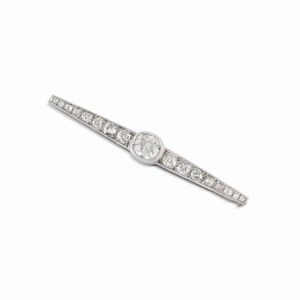 SPILLA A BARRETTA CON DIAMANTI in oro 18kt, con al centro un diamante taglio antico di ct 1.90 circa, impreziosita [..]