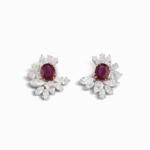 PAIO DI ORECCHINI CON RUBINI BIRMANI E DIAMANTI in platino e oro giallo 18kt, impreziositi da due rubini birmani [..]