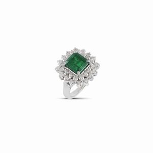 ANELLO CON SMERALDO E DIAMANTI in oro bianco 18kt, al centro uno smeraldo taglio ottagonale di ct 3 circa, circondato [..]