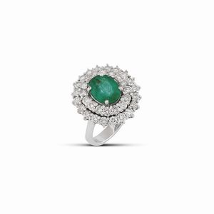 ANELLO CON SMERALDO E DIAMANTI in oro bianco 18kt, al centro uno smeraldo taglio ovale di ct 2 circa, circondato [..]