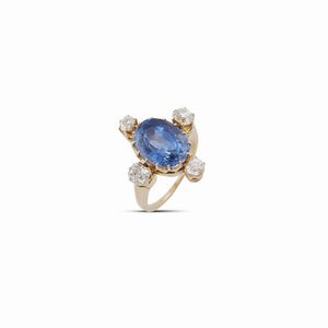 ANELLO CON ZAFFIRO E DIAMANTI in oro giallo 18kt, convertibile in spilla, composta da parte sommitale amovibile [..]