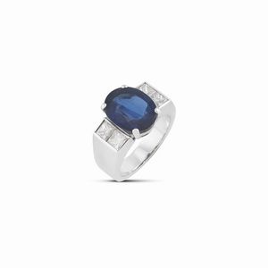 ANELLO CON ZAFFIRO E DIAMANTI in oro bianco 18kt, impreziosito da uno zaffiro taglio ovale di ct 4.70 circa affiancato [..]