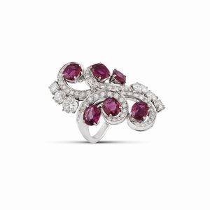 ANELLO CONTRARIE CON RUBINI E DIAMANTI in oro bianco 18kt, realizzato seguendo un motivo a tralcio, impreziosito [..]