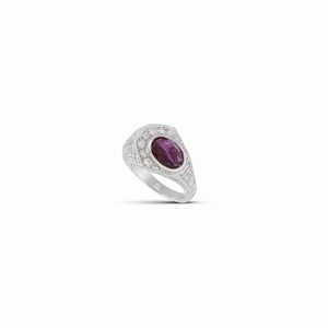 ANELLO CON RUBINO E DIAMANTI in oro bianco 18kt, impreziosito da un rubino taglio ovale di ct 2 circa, circondato [..]
