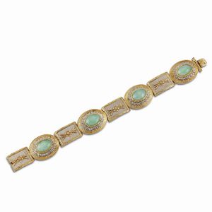 BRACCIALE AD AMPIA FASCIA CON DIAMANTI E GRANATI in oro giallo e bianco 18kt, composto da una serie di elementi [..]