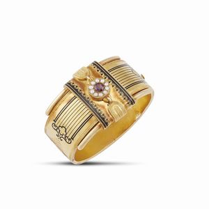 BRACCIALE A SERPE in oro giallo e bianco 18kt, decorato in smalti e impreziosito da due rubini taglio navette [..]