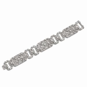 BRACCIALE ART DECO CON DIAMANTI in platino, composto da una serie di maglie rettangolari concatenate e impreziosite [..]