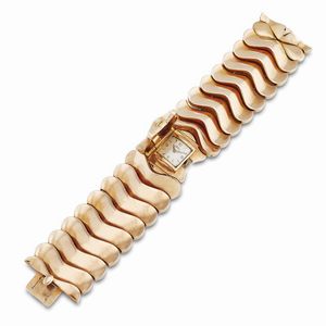 BRACCIALE AD AMPIA FASCIA CON OROLOGIO A SCOMPARSA in oro rosa 18kt, composto da una serie di maglie ondulate [..]