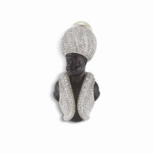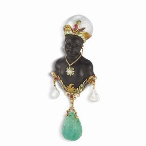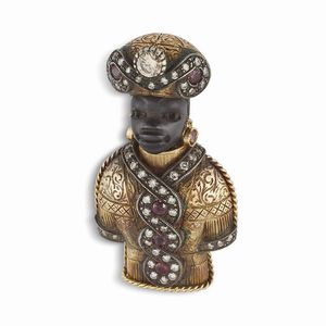 CODOGNATO SPILLA "MORETTO" in oro, argento ed ebano, raffigurante un busto di moretto con turbante impreziosito [..]