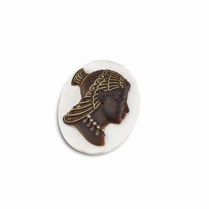 CAMMEO IN CALCEDONIO di forma ovale, raffigurante il profilo di una donna faraone, impreziosito da rubini e smeraldi [..]