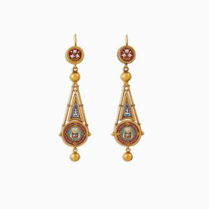PAIO DI ORECCHINI PENDENTI CON MICROMOSAICI in oro giallo 18kt, decorati con motivi figurati realizzati in micromosaico, [..]